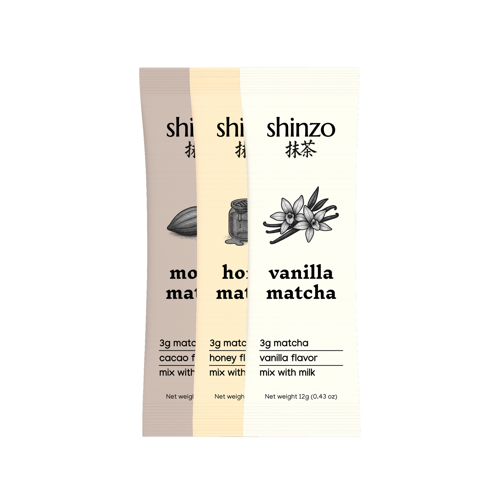 A discovery 30-pack of vanilla, honey, and mocha matcha. Enjoy hot or iced with your choice of milk.